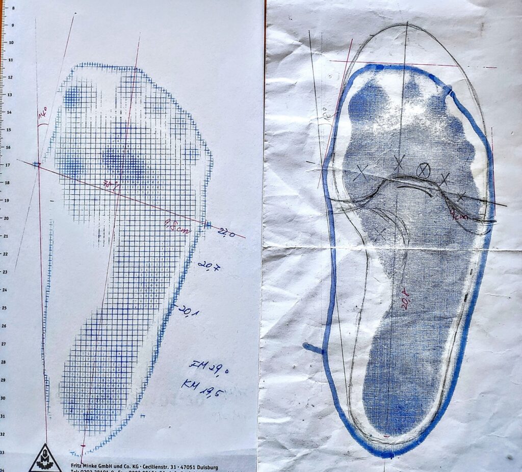 足の輪郭、どこに圧がかかっているかなど、その人の足を知る上で、ラストやインソールを制作する上で重要な情報が得られる最重要アイテム。